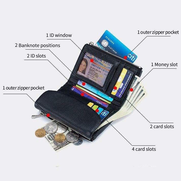 âšÂ Smart Structure: 1 large bill slot, 6 card slots, 2 ID windows, 2 zippered coin pockets, and a zipper! All-in-one organization.